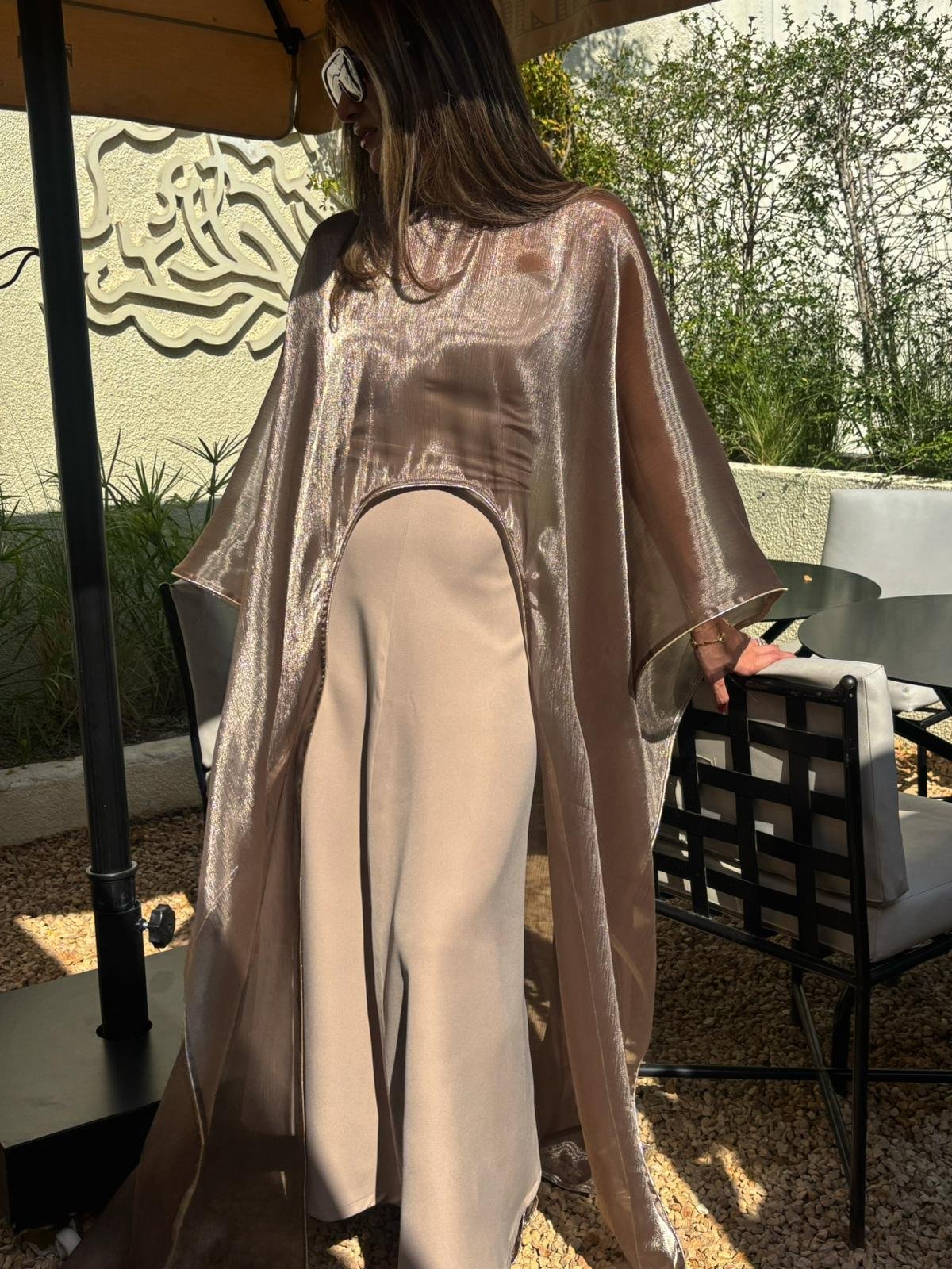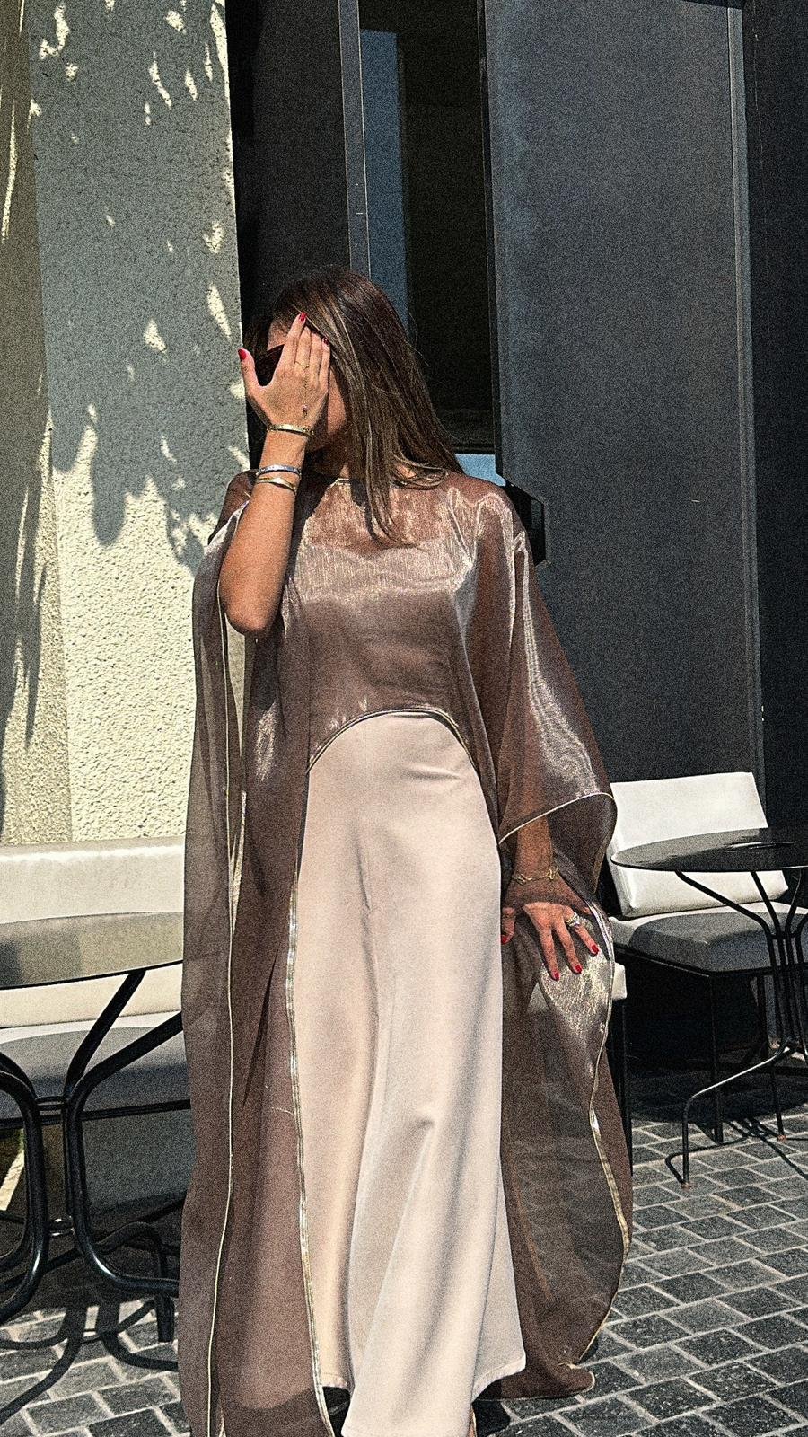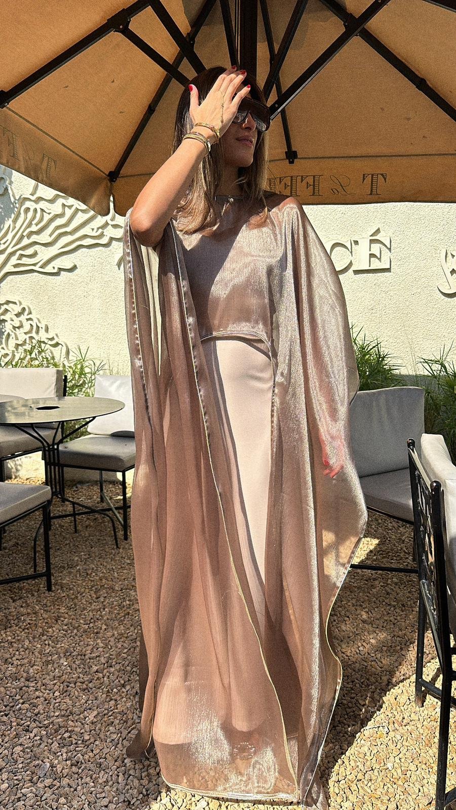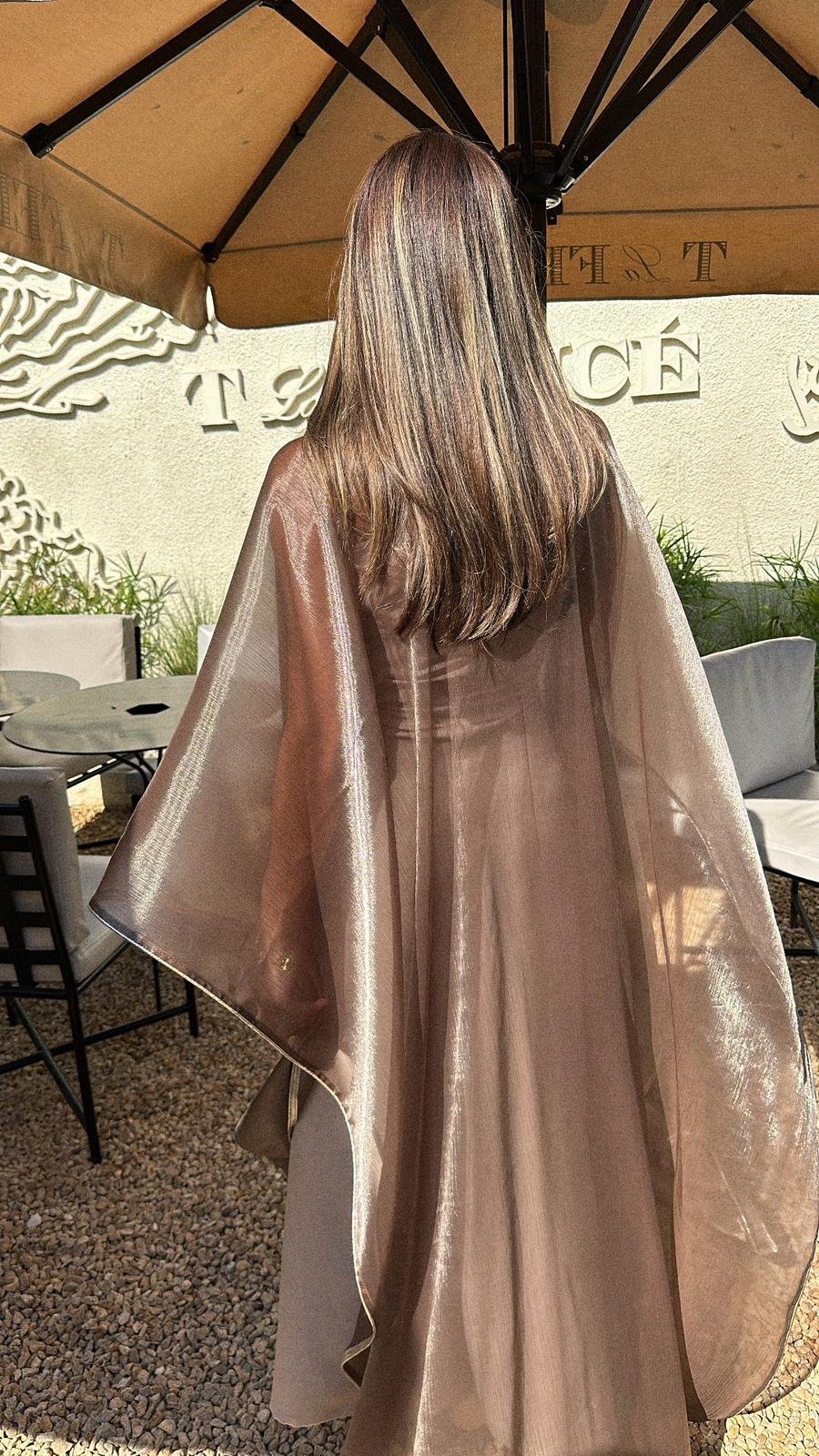 Piece#2: Outer Cape: A flowing metallic overlay with a semi-sheer finish, made of shiny material with touches of golden embroidery